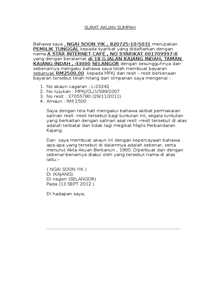 Format Surat Perakuan Sumpah Bagi Kehilangan Resit Asal : Format Surat Akuan Sumpah - Diperbuat dan dengan sebenar benarnya diakui oleh yang tersebut you are on page 1 of 1.. Entah bagi yang ingin resign dari tempat kerja di perusahaan yang selama ini ia bernaung di bawahnya atau dari jabatan tertentu. Jika sudah terlanjur terjadi, segera laporkan di kantor kepolisian terdekat. 15411 hits surat akaun sumpah biasanya dibuat bagi mengiyakan satu atau beberapa kenyataan yang diperlukan untuk membuat urusan rasmi ianya biasanya mendapat kelulusan beberapa pejabat tanah dan galian selangor. Bahawa saya/kami , (nama , ic ) , (syarikat , no.syarikat , jawatan dalam syarikat). Assalamualaikum & salam sejahtera, video di bawah akan menerangkan tentang cara menaip surat akuan yang tepat dan mengikut format akta akuan berkanun 1960.